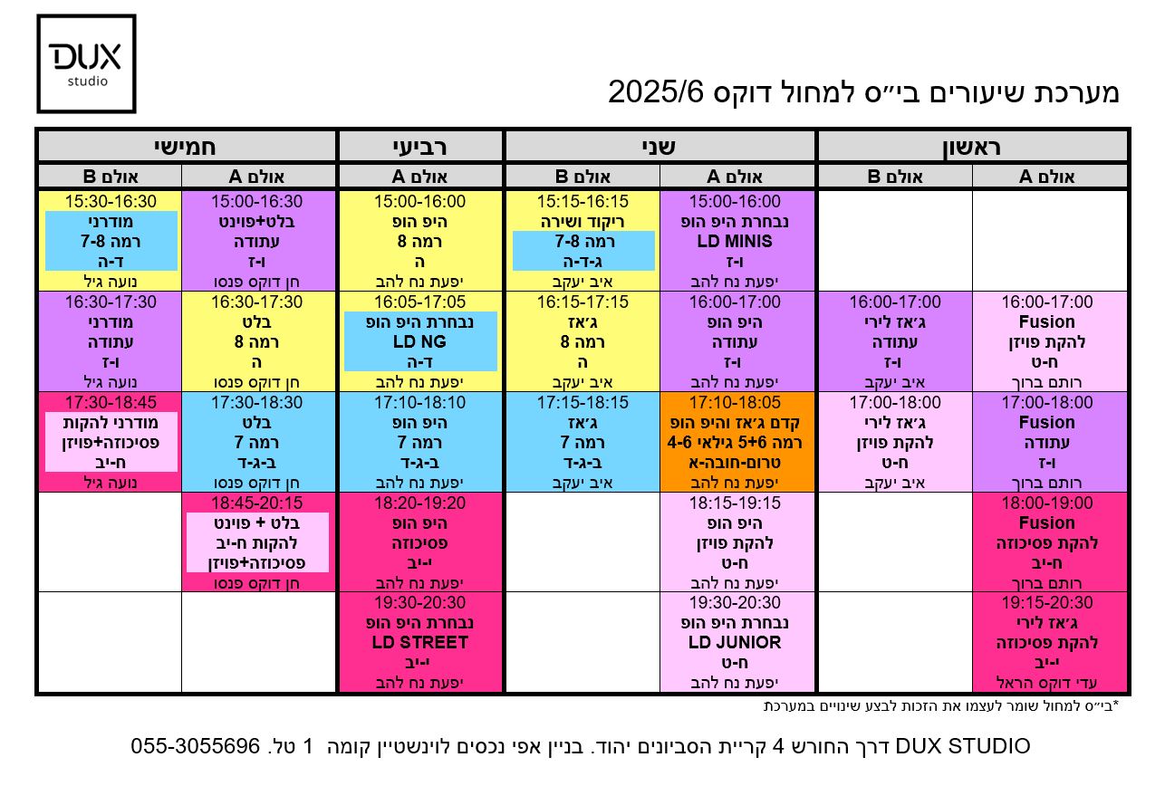 בביה" ס למחול דוקס רוקדים מאות ילדים מגילאי 3.5 ועד בוגרים במטרה להקנות לרקדנים התנסות במגוון רחב של סגנונות מחול בהדרכתם של צוות המורים המקצועי והמנוסה ביותר בישראל.